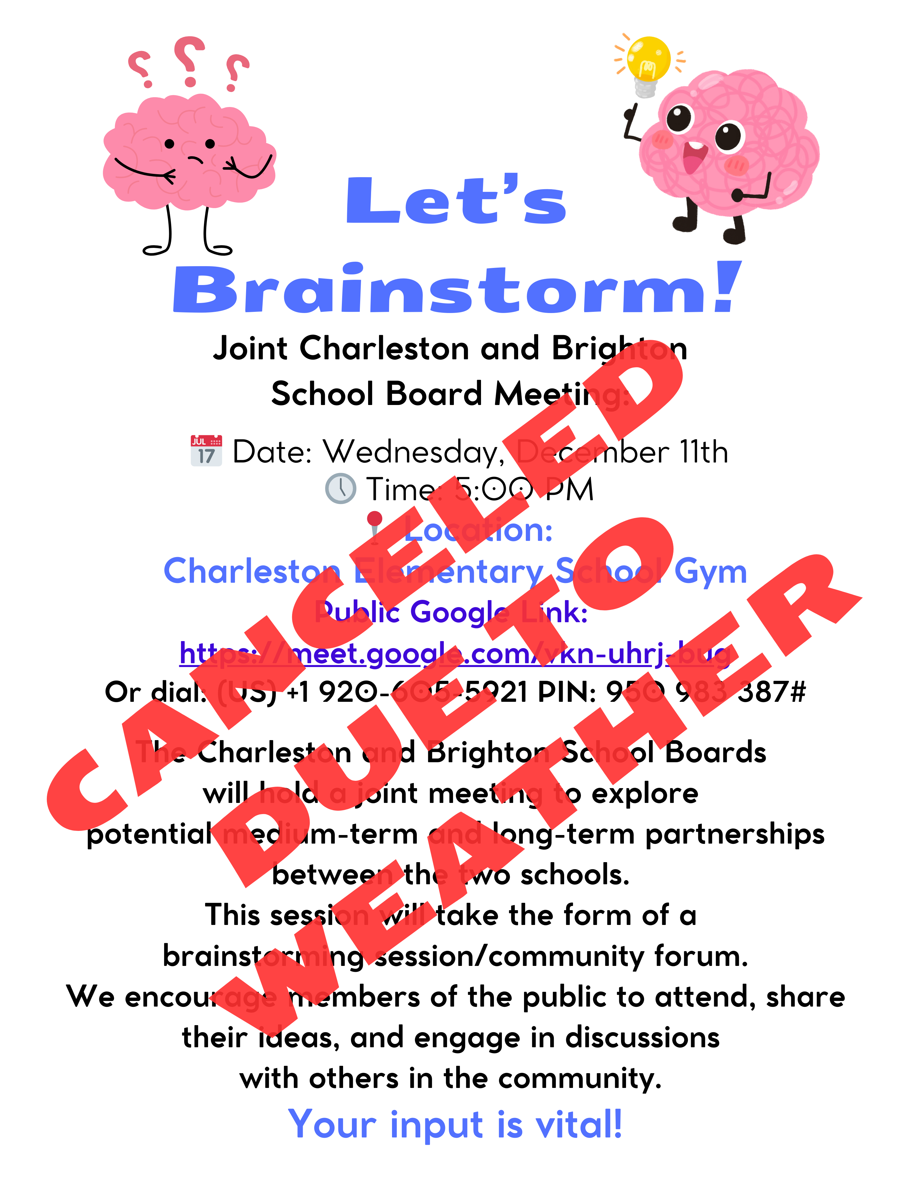 The joint Charleston and Brighton Board Meetings and Community Forum, scheduled for tonight, has been CANCELED due to weather.
